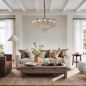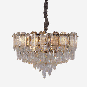 This chandelier redefines sophistication with its multi-layered cascading crystals, meticulously cut to refract dazzling light. When illuminated, it creates a breathtaking display of brilliance, filling your space with warmth and opulence.