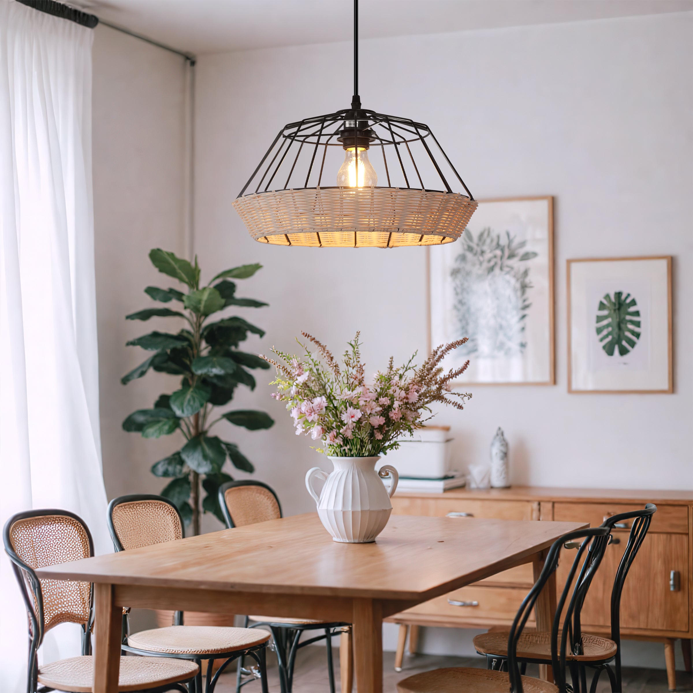 Glyph-Geometric Rattan and Iron Pendant Light for Dining, Kitchen, and Living Rooms