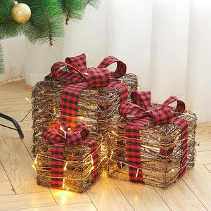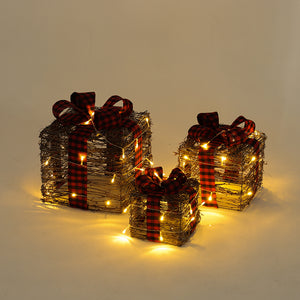 Add natural texture and festive charm to your holiday décor with this 3-piece rattan gift box set. Each beautifully woven box features a classic checked bow and built-in warm white LED lights, creating a cosy seasonal glow. The three graduated sizes (15cm, 20cm, 25cm) allow for elegant layered displays on mantels, sideboards, or under the Christmas tree – perfect for storing small gifts, ornaments, or simply adding rustic warmth to your seasonal styling.