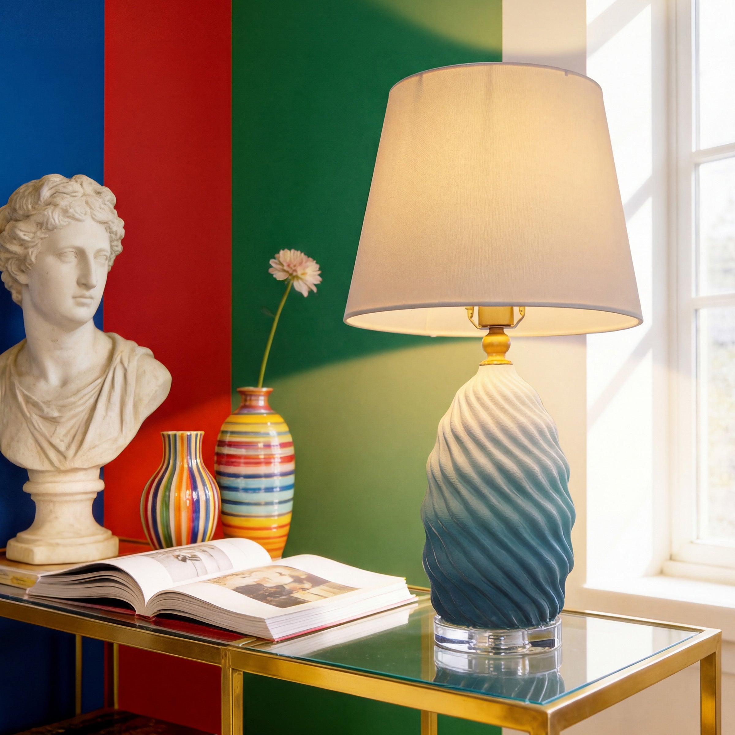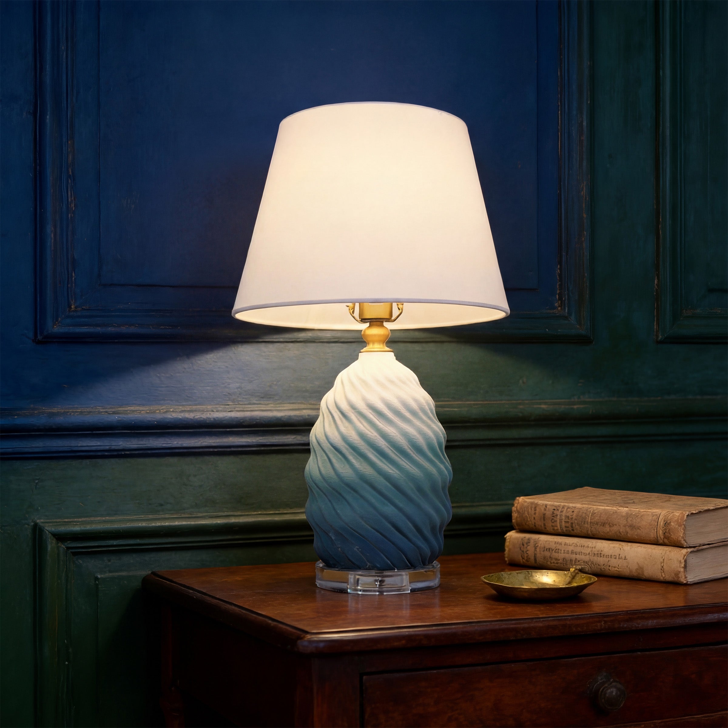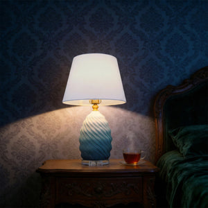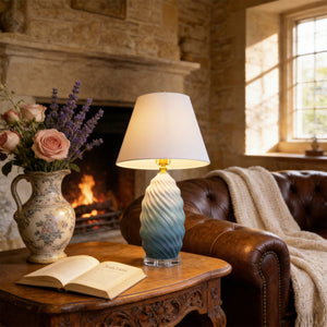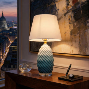 Elevate your interior with this striking 3D ceramic table lamp, featuring a captivating blue-to-white gradient and sculptural spiral texture. Crafted from premium ceramic, accented with warm brass and a clear crystal base, it is topped with a refined fabric shade that diffuses a soft 3000K warm glow. With CE-certified drive and timeless aesthetics, this piece blends artistry and function—perfect for bedside tables, living rooms, or refined hospitality settings.