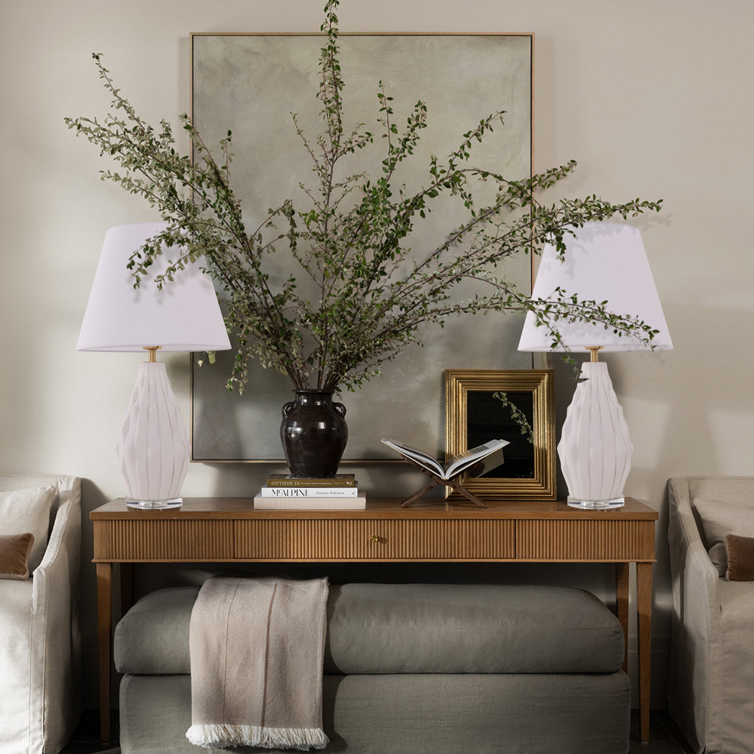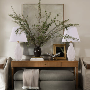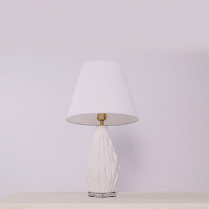 Pure white ceramic accentuates the intricate texture and refined details of every lamp. The minimalist fabric shade harmonises beautifully with the crystal-clear base, while golden brass accents provide a touch of luxury. Together, these elements create a composition of understated elegance that transcends passing trends.