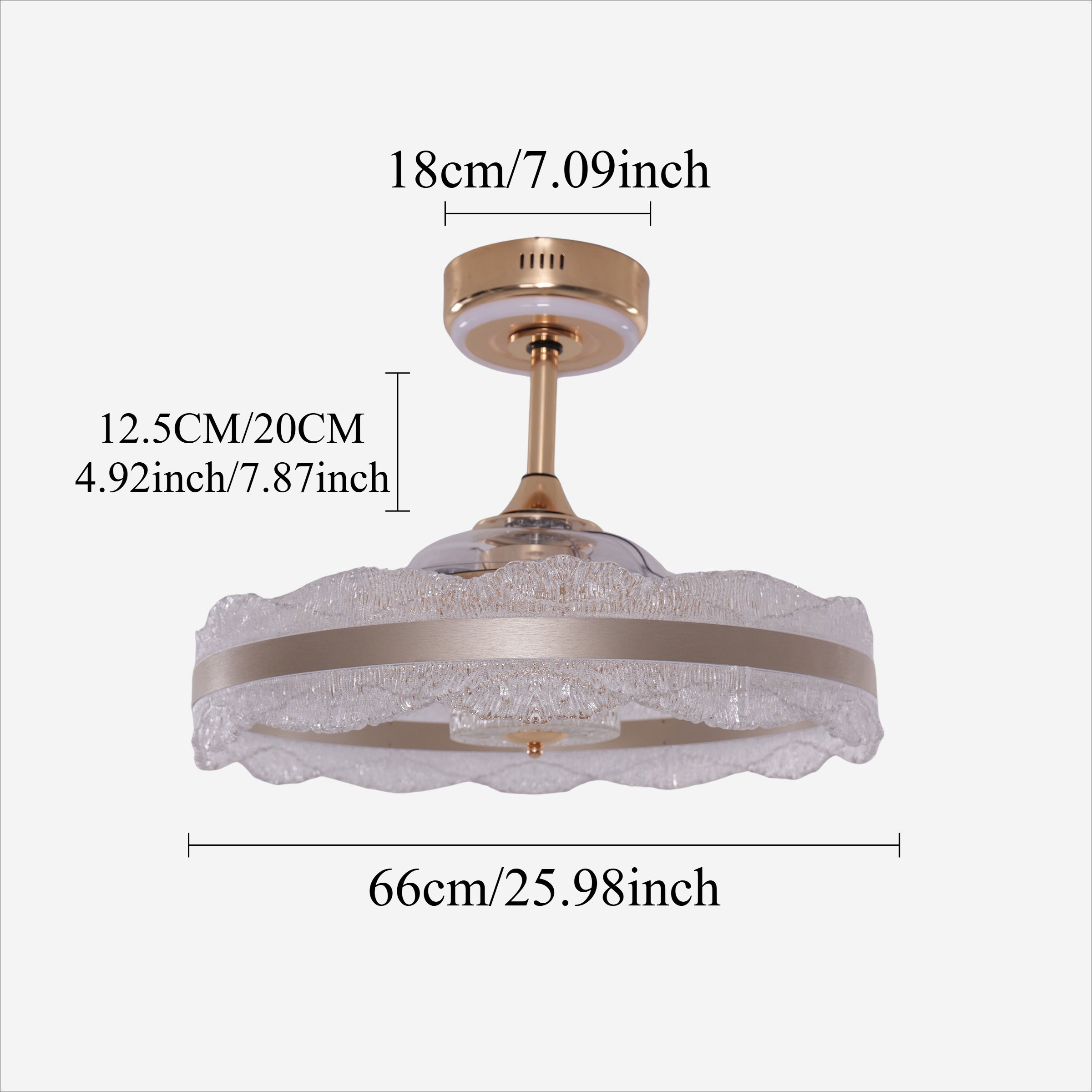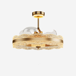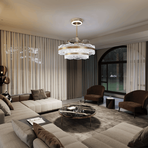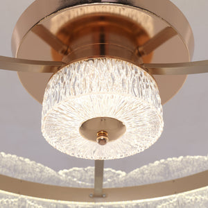 This modern ceiling fan light features a stunning double-ring crystal acrylic design, bringing an elegant and luxurious touch to any space. The golden aluminum-copper finish complements the intricately textured acrylic, creating a dazzling visual effect that enhances your home décor.
