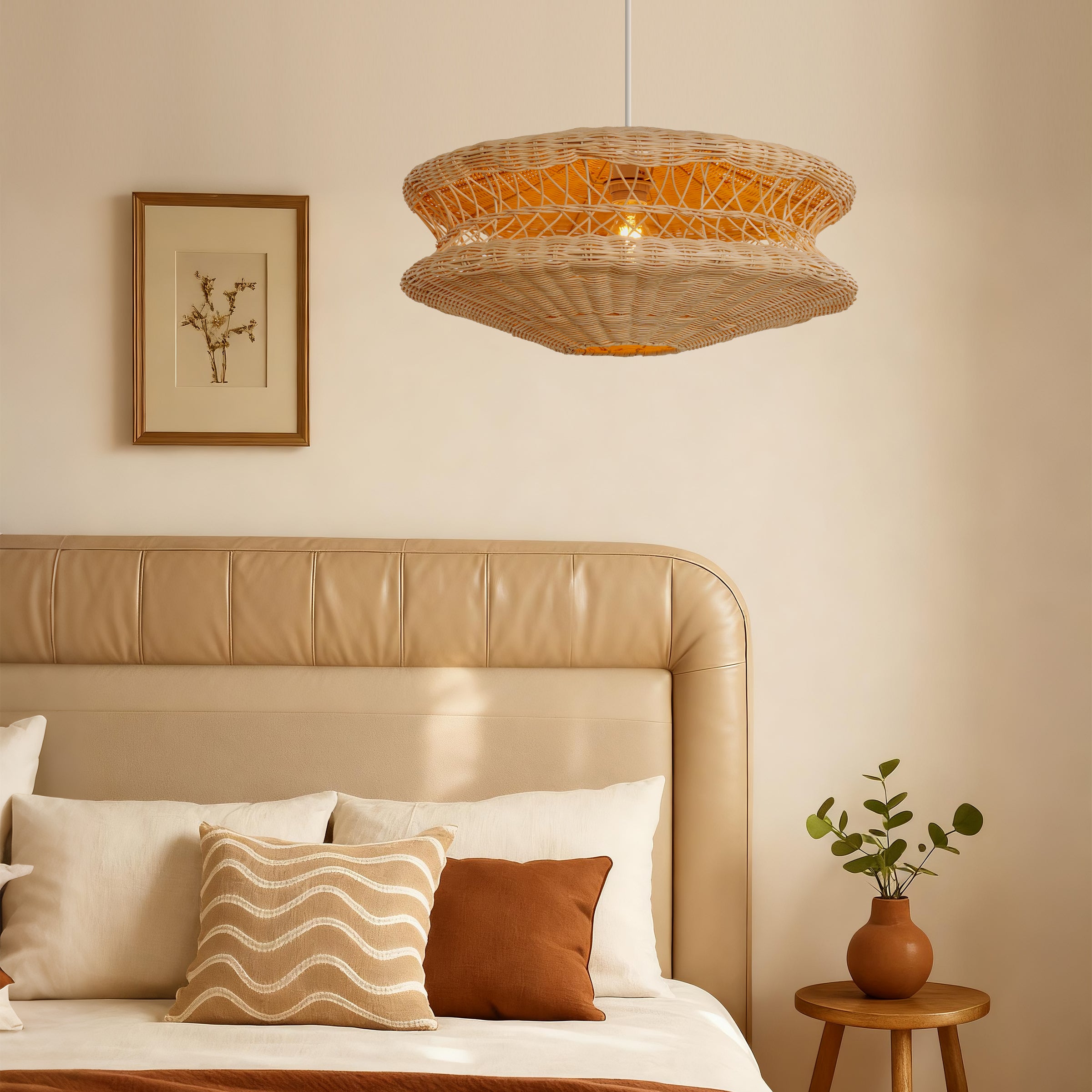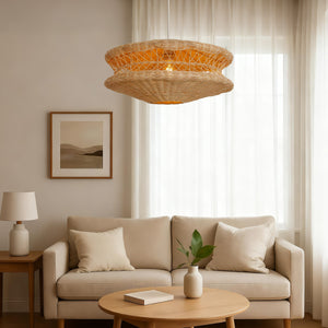 This handwoven rattan pendant light blends natural aesthetics with modern pendant lighting design, featuring a unique and artistic structure. Crafted from high-quality natural rattan and meticulously woven by skilled artisans, it retains the beauty of organic materials while showcasing exquisite craftsmanship. The warm ambient lighting softly filters through the woven rattan shade, creating a cozy and elegant atmosphere perfect for various interiors.