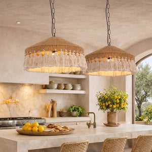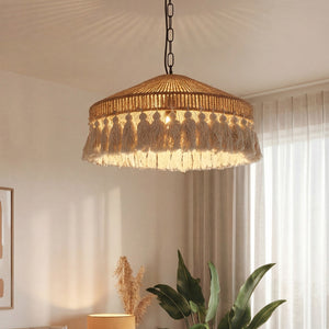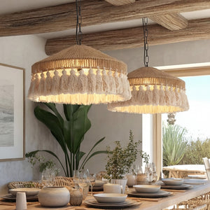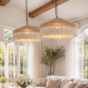 Boho Woven Pendant Light with Tassels, Handcrafted Hemp Rope Hanging Ceiling Light for Dining Room & Living Room