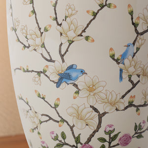 - Traditional Chinoiserie Design – Elegant ginger jar silhouette paired with hand-painted floral and bird motifs, featuring a cream base with soft pink, blue and white details, embodying classic Eastern aesthetic.