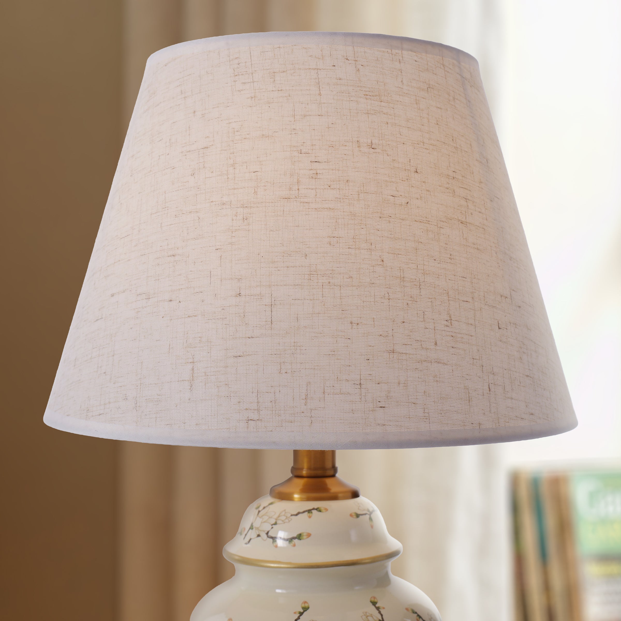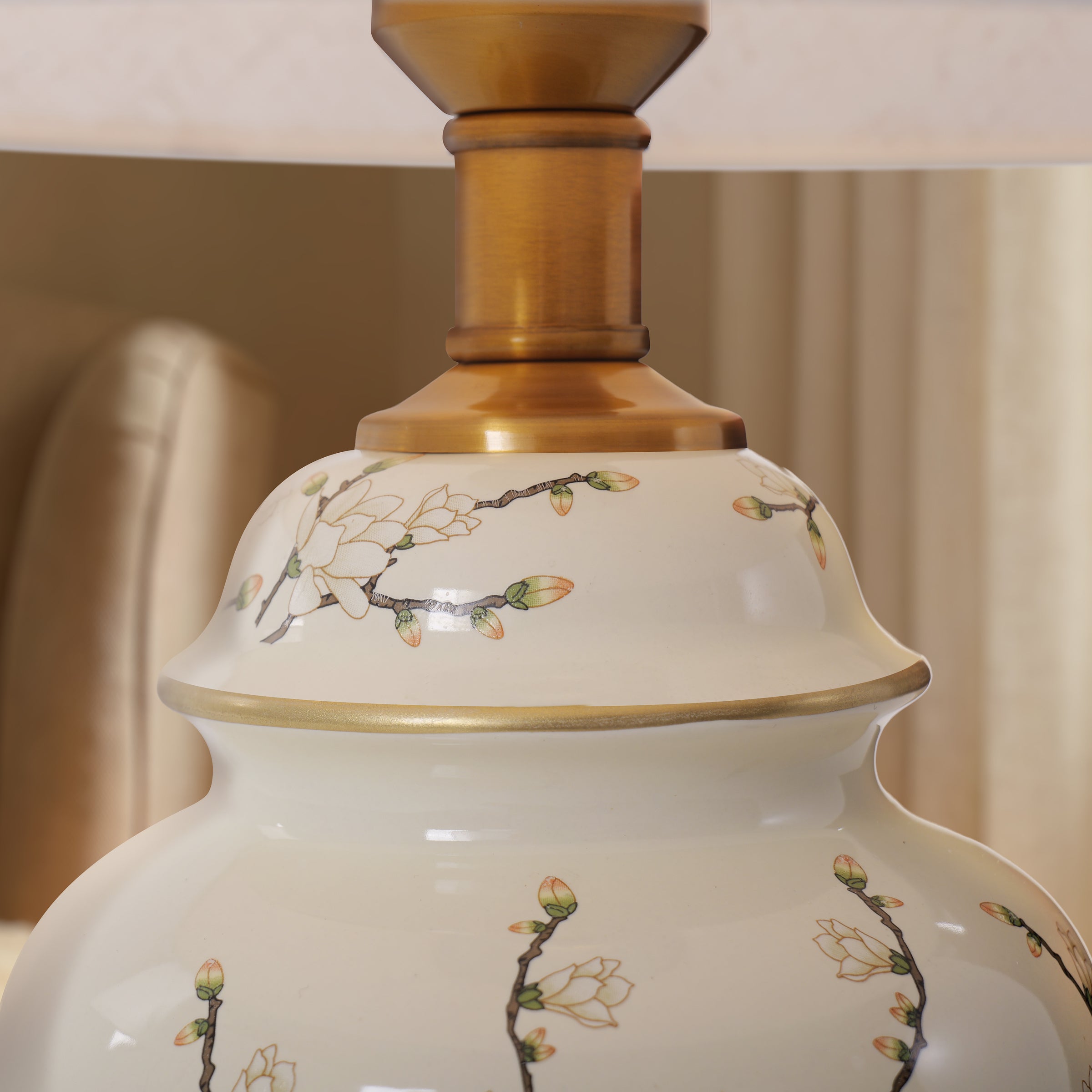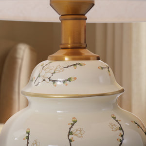 Infuse your interior with timeless elegance and serene charm with this Chinoiserie ceramic table lamp, crafted to blend traditional Eastern artistry with modern functionality. Its ginger jar-shaped ceramic body is hand-painted with delicate floral and bird motifs against a soft cream backdrop, while the lustrous brass base and linen shade complete the look with warm, sophisticated contrast. Designed to cast a gentle, ambient glow, this lamp serves as both a practical lighting solution and a striking decorative accent, perfect for elevating the aesthetic of living rooms, bedrooms, studies or office spaces.