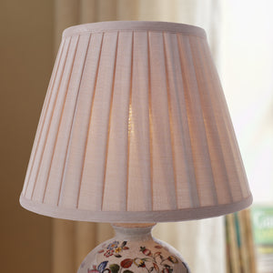 Bring a touch of timeless Eastern elegance to your space with this hand-painted porcelain table lamp, a masterpiece of Chinoiserie design. Its curvilinear, vase-shaped porcelain body is adorned with intricate floral and foliage motifs, rendered in rich, harmonious colours against a textured cream backdrop, creating a visual expression of traditional artistry. Topped with a classic pleated linen shade and anchored by a polished brass base, this lamp casts a warm, diffused glow that enhances both functionality and décor, making it a refined addition to living rooms, bedrooms, studies or offices.