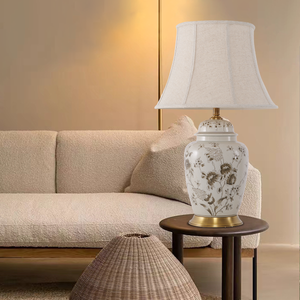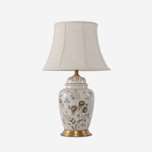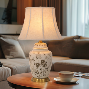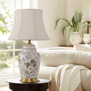 This ceramic and copper table lamp features an intricate chrysanthemum design and a soft fabric shade that diffuses warm, ambient light. With its coffee-toned ceramic base, this lamp brings a touch of classic elegance to your space. Perfect as a bedside table lamp or a decorative ceramic lamp for the living room, it adds both function and artistic style to any room.