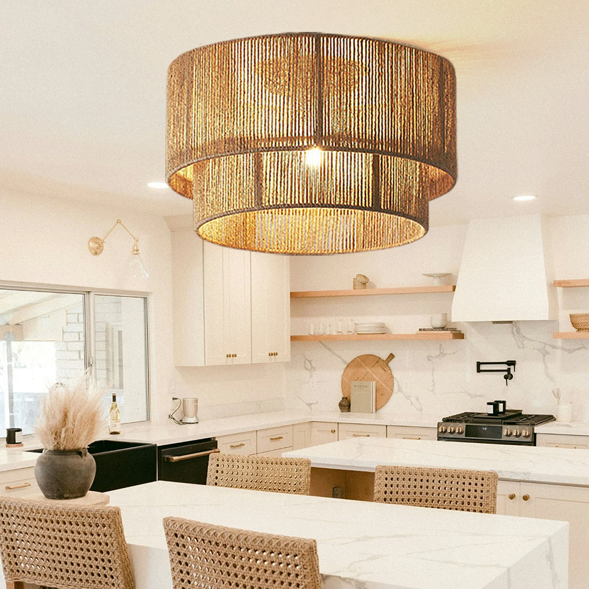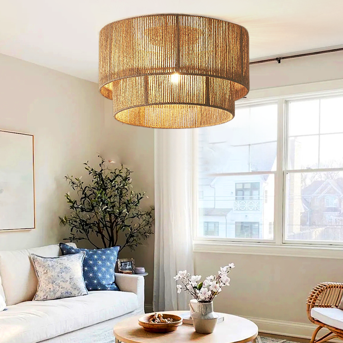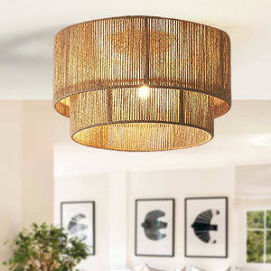 The Double-Tier Hemp Rope LED Pendant Light blends natural materials with modern design, offering a distinctive rustic charm. Its warm LED lighting and double-tier structure create a cozy ambiance. Perfect for dining rooms, living rooms, or bedrooms.