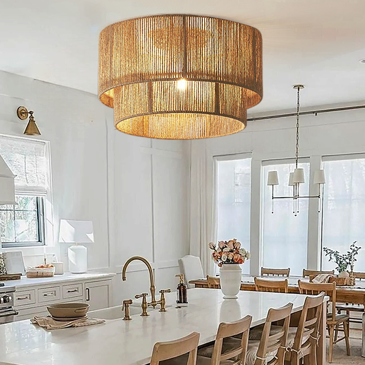 The warm LED lighting of this pendant light creates a cozy and inviting atmosphere. Its double-tier structure enhances light distribution, making any space feel more welcoming. Perfect for creating a relaxing environment in living rooms, dining rooms, and bedrooms.
