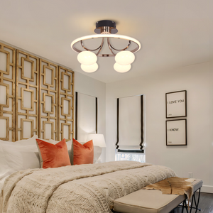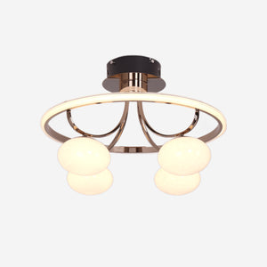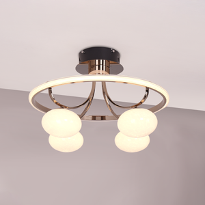 This modern ceiling light features a unique circular design that is both sleek and refined. Four spherical shades are symmetrically arranged, creating a balanced visual effect. The smooth surface of the metal structure adds a stylish touch, complementing the clean lines of the ring and shades.