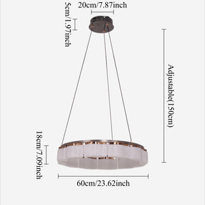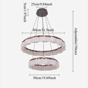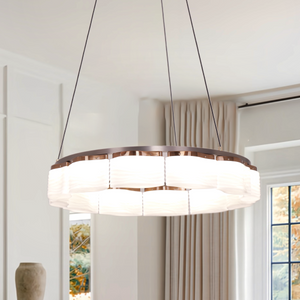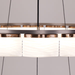 This pendant light features an antique bronze gold tone that exudes a subtly luxurious retro vibe. The black hanging cord structure is both sturdy and elegant, while the metal frame is surrounded by stacked, ripple-patterned lampshades, enhancing the sophistication and texture of the design.