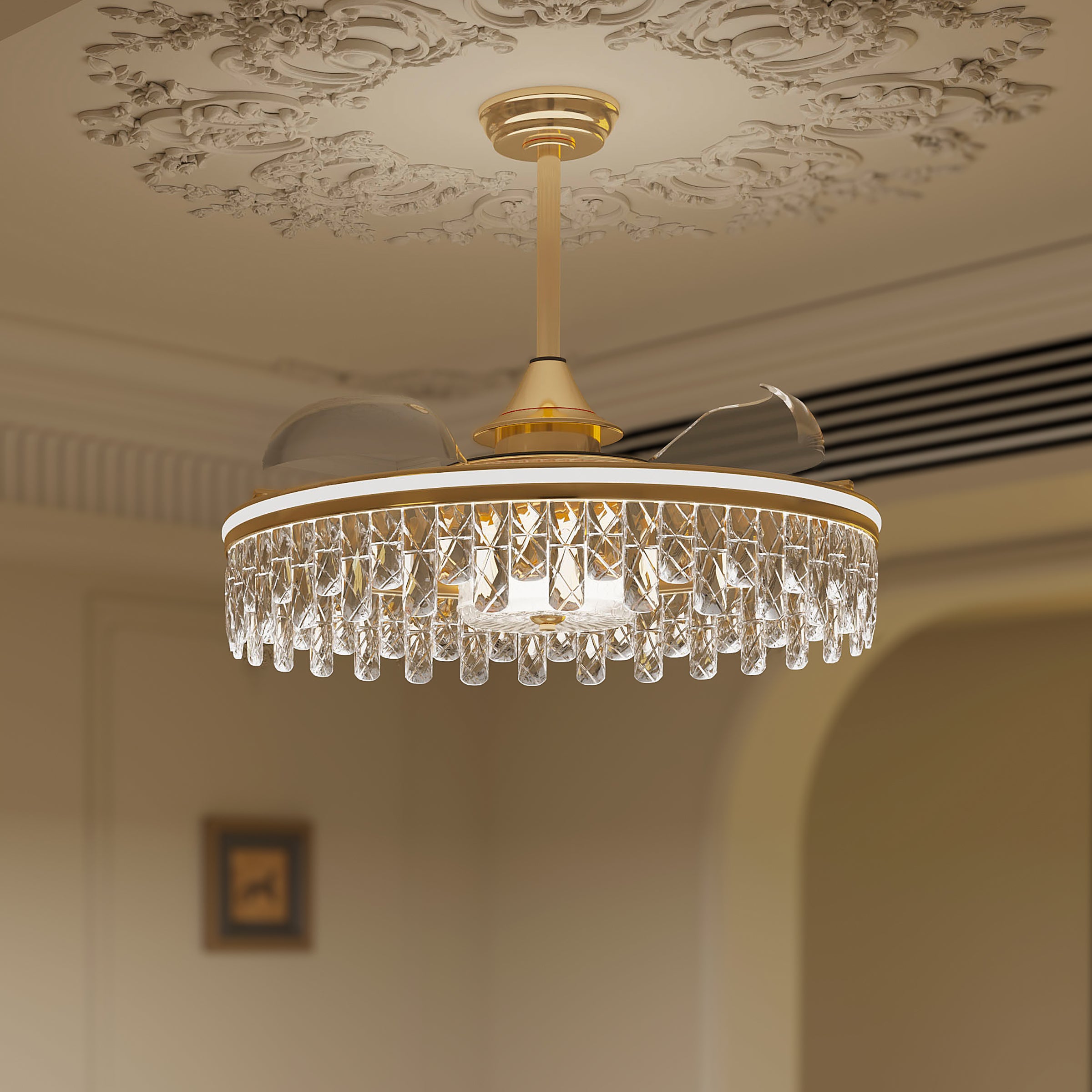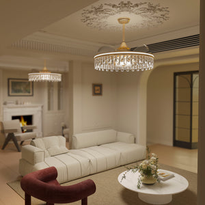Luxurious Design: Crafted from iron, crystal, and copper, this ceiling fan features an elegant gold finish, adding a luxurious touch to any space.