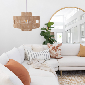 Make a bold yet natural statement with this handwoven rattan pendant light, featuring a layered geometric design that adds depth and character to any room. Whether suspended over a dining table, illuminating a cozy living area, or enhancing the ambiance of a café or boutique, its eye-catching structure effortlessly complements modern, bohemian, Scandinavian, and coastal interiors. The adjustable hanging length allows for versatile placement, making it suitable for both high and low ceilings.
