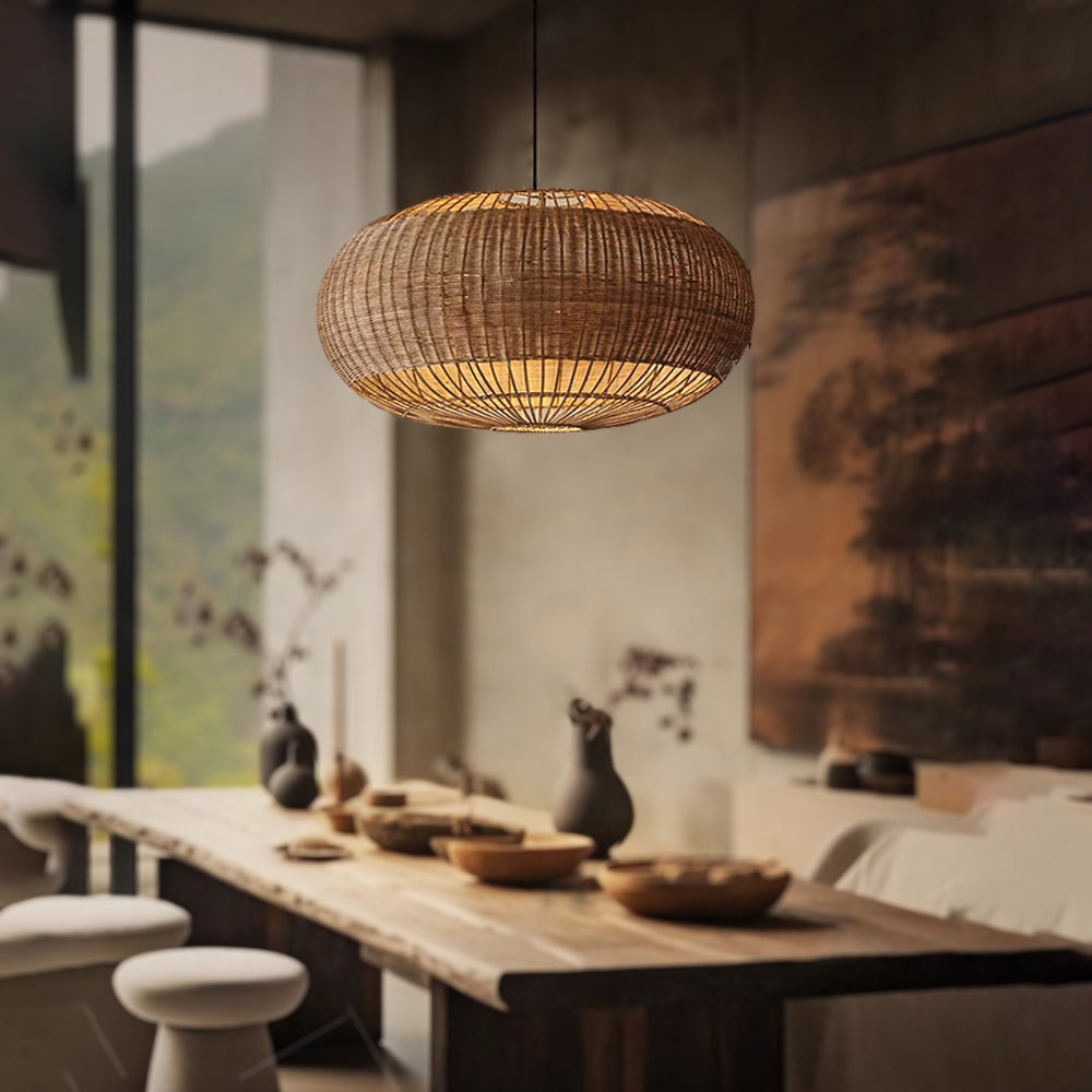 Handcrafted Rattan Pendant Light in Flat Round Basket Shape