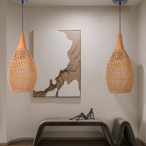 The artisanal pendant light showcases a distinctive water-drop shape, blending refined rattan with durable wood components. Its crafted design infuses a natural elegance into any room, generating a cozy ambiance.