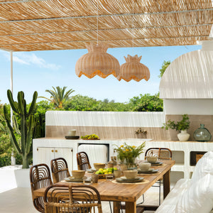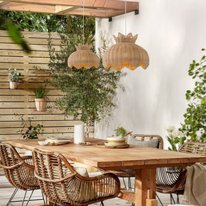Expertly crafted from bamboo and natural rattan, this pendant light embodies organic beauty with a timeless charm. The woven dome-shaped shade showcases intricate craftsmanship, allowing the texture of the material to stand out. The natural finish enhances its earthy and calming appeal, making it an ideal choice for those who appreciate eco-friendly, artisanal home décor. The sturdy iron frame and high-quality rattan weave ensure durability while maintaining a lightweight and airy feel.