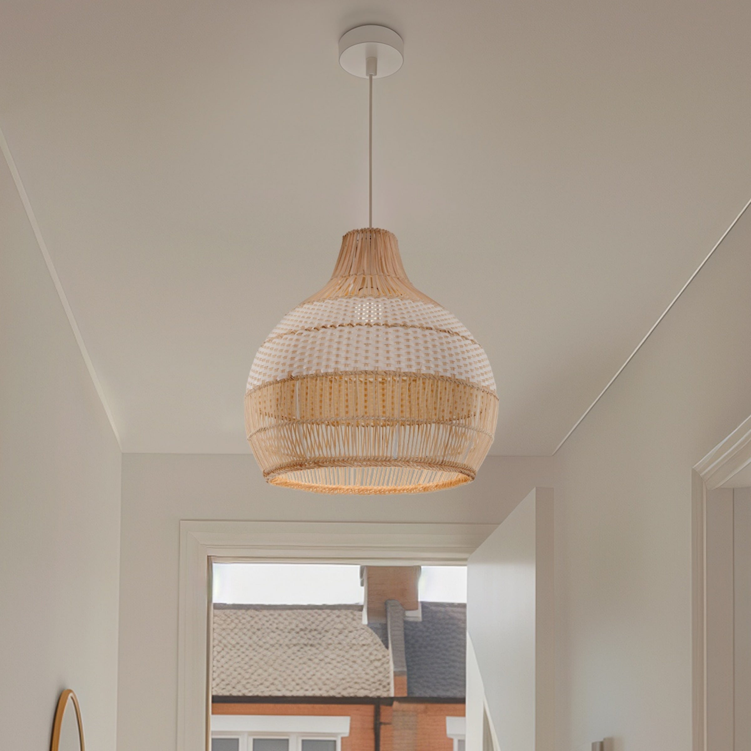 The lightweight design ensures easy installation, while the natural rattan shade diffuses a warm, cozy ambient glow. -