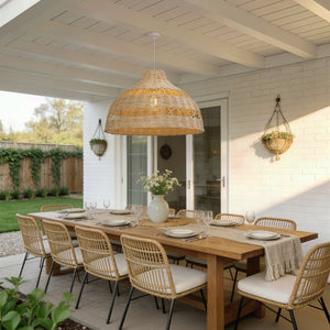 A: Absolutely. The woven lamp shade creates soft ambience that enhances dining room lighting for both everyday meals and gatherings.