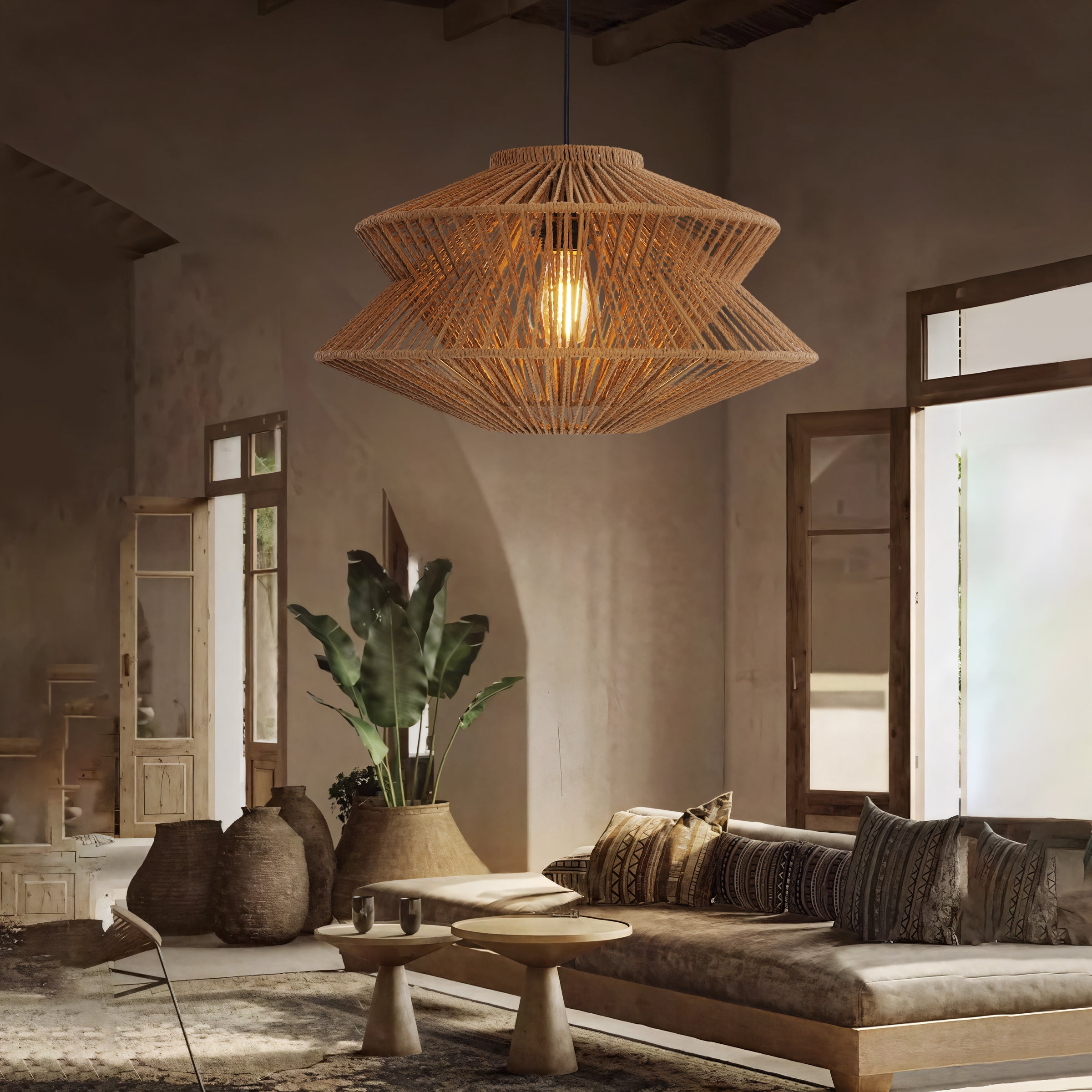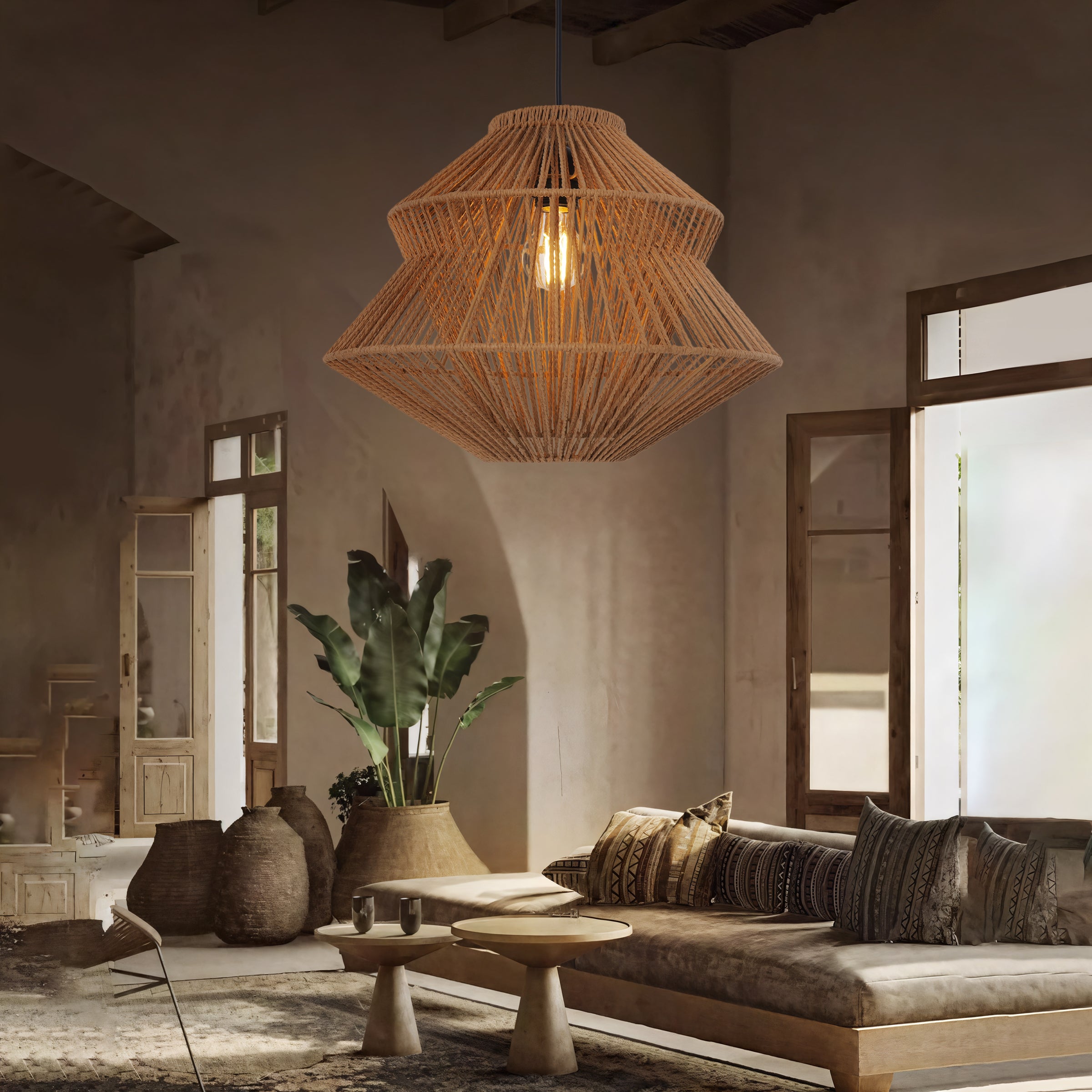 The intricately woven paper rope shade allows light to gently filter through, creating a warm and cozy atmosphere while showcasing exquisite craftsmanship.