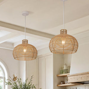 Bring organic charm and modern elegance to your space with this rattan pendant light. Perfect for kitchen lights, this handcrafted light features a mesh design, creating a warm, ambient glow in dining rooms, cozy living rooms, or bedrooms. Made from natural rattan, it adds texture and warmth to your décor. The 120cm adjustable cord makes it adaptable for both high and low ceilings, making it a versatile lighting solution for any space.