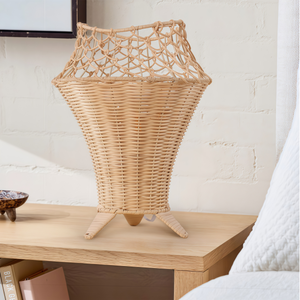 Made from handwoven rattan over a sturdy iron frame, it reflects thoughtful craftsmanship. Lightweight and easy to move, its shape blends function and decorative beauty. A charming lighting accent for natural living spaces.