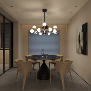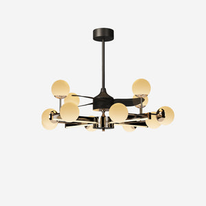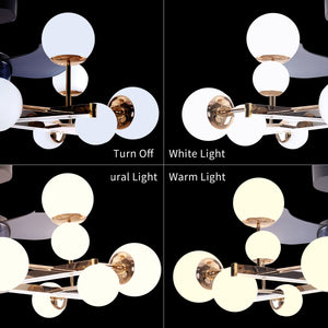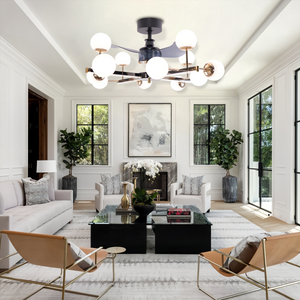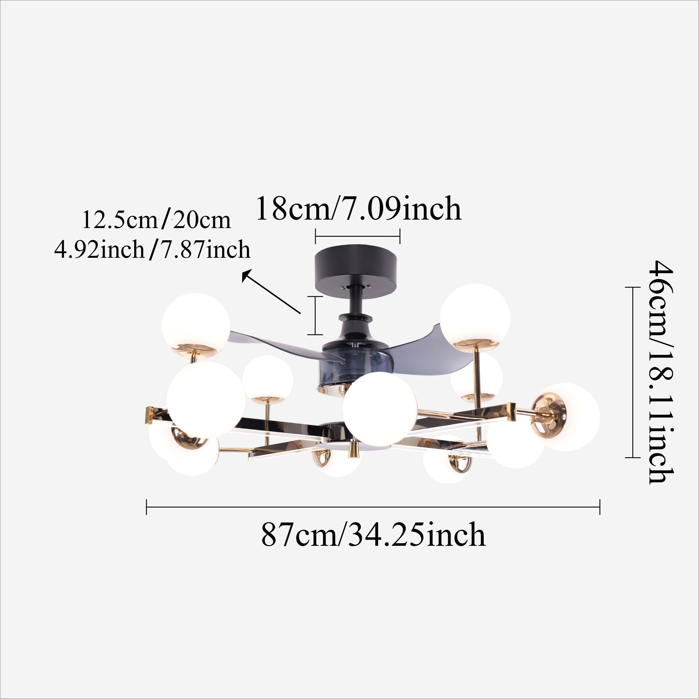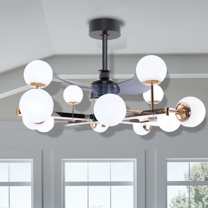The Modern Sphere 3-Blade Fan Light features four sleek branches, each adorned with multiple spherical lampshades. This striking design creates a visually captivating statement while delivering both illumination and cooling in one elegant fixture, making it a chandelier light that doubles as a functional ceiling fan with lights.