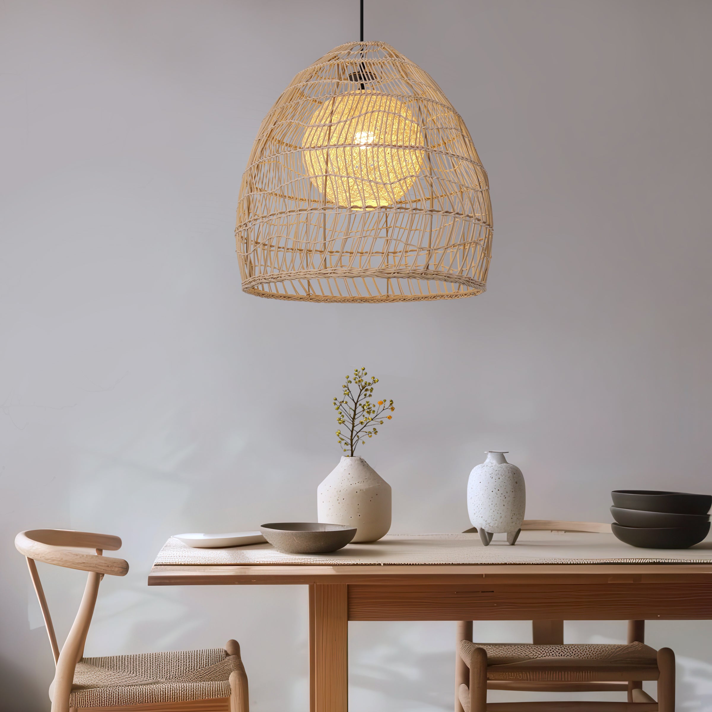 The natural rattan shade allows light to diffuse gently, casting cozy shadows and creating a relaxing, inviting ambiance.