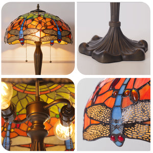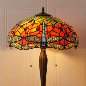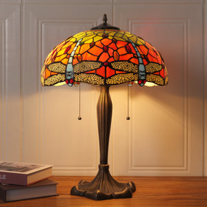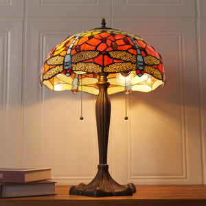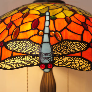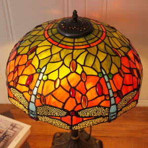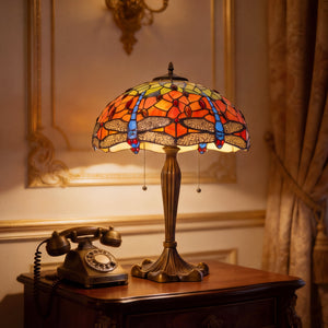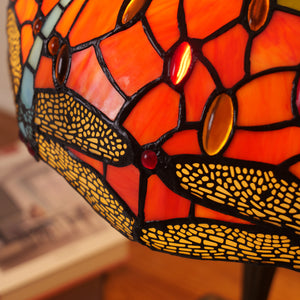This Tiffany Table Lamp from the Dragonfly Series showcases hand-cut stained glass in orange, blue, or green, set within a bronze or brass tree-inspired base that adds organic elegance. Available in 16-inch sizes, this exquisite bedside lamp emits a warm, colourful ambient glow, making it ideal for living rooms or as a functional bedside light. Combining artisanal craftsmanship with timeless design, it serves as both a collectible statement piece and practical accent lighting for UK homes, studios, and lounges.