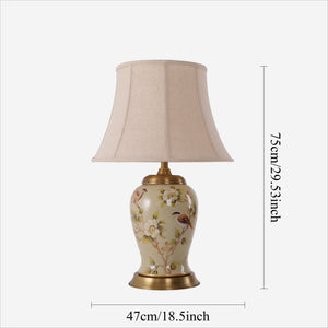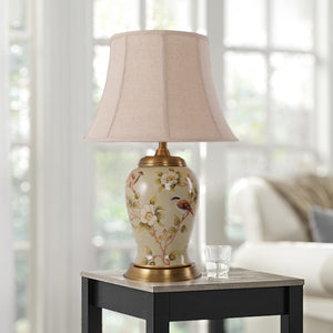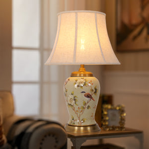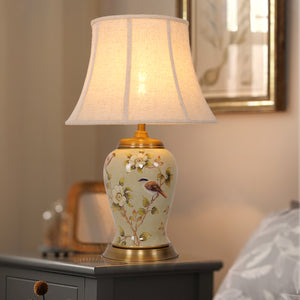 Transform your space with this vintage ceramic table lamp, showcasing hand-painted birds and floral patterns on a ceramic base. The fabric lampshade gently diffuses light to create a warm and cozy ambiance. Its classic brass base enhances the overall design, making it a perfect addition to living rooms, bedrooms, or studies, blending elegance with functionality.