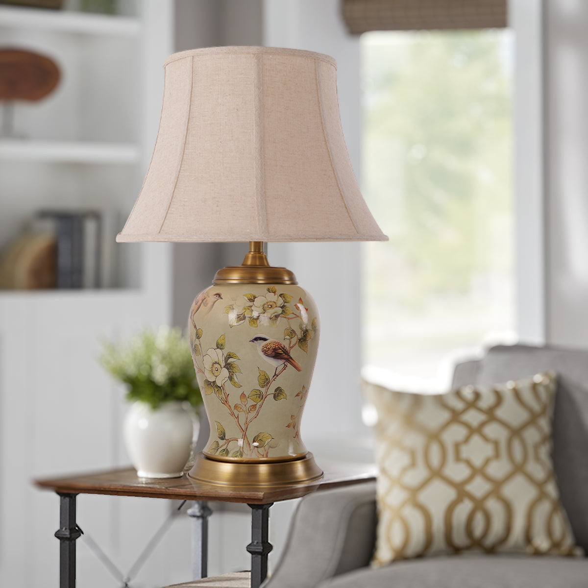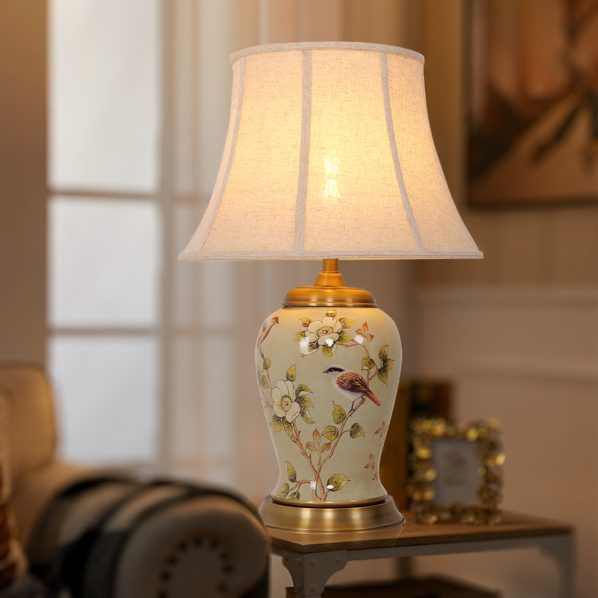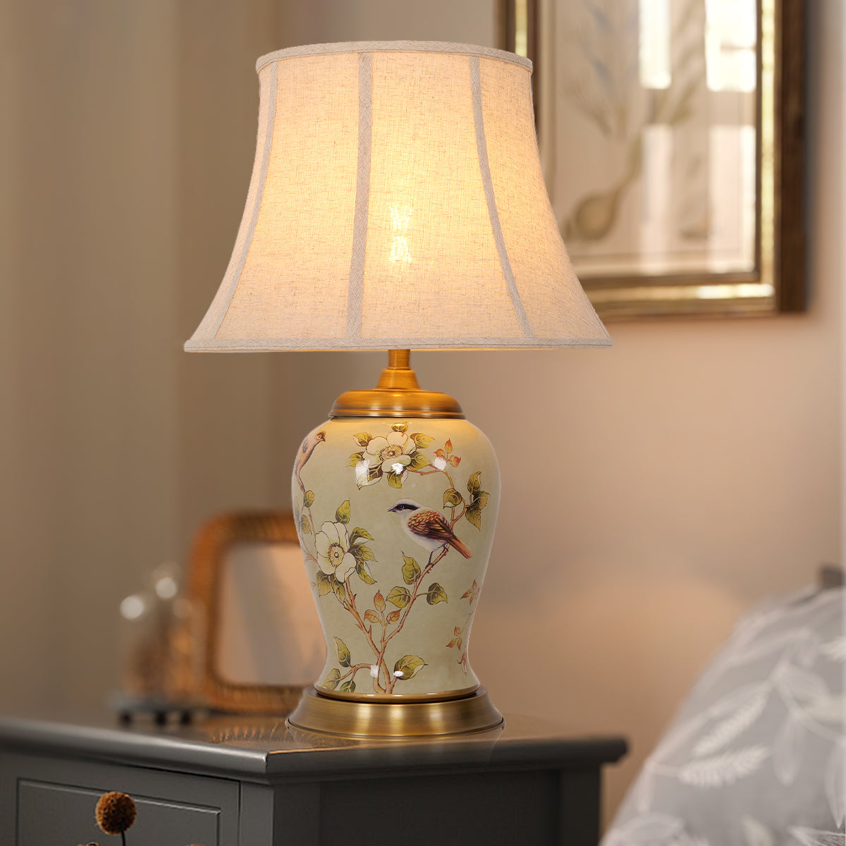 Handmade Vintage Ceramic Bird Floral-Pattern Table Lamp with Fabric Shade for Living Room and Bedroom