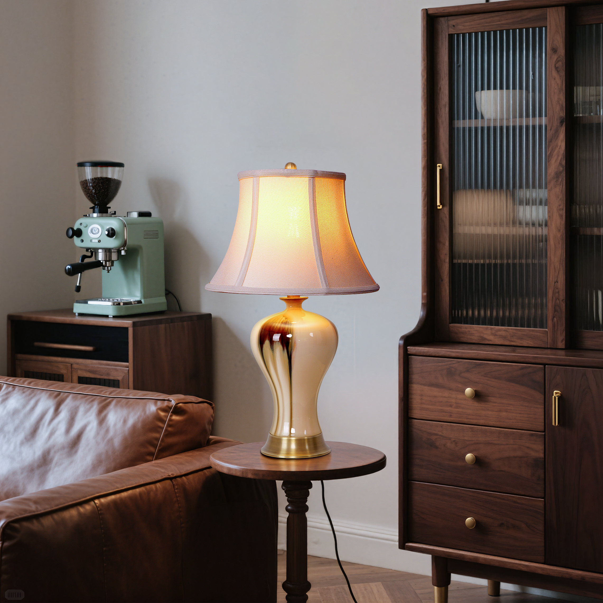 Vintage Camellia Ceramic Table Lamp with Copper Base and Fabric Shade